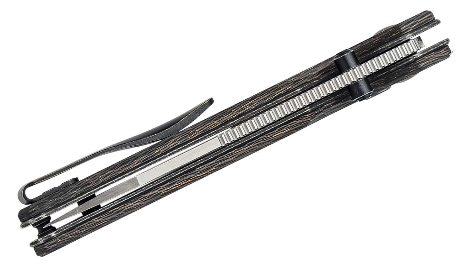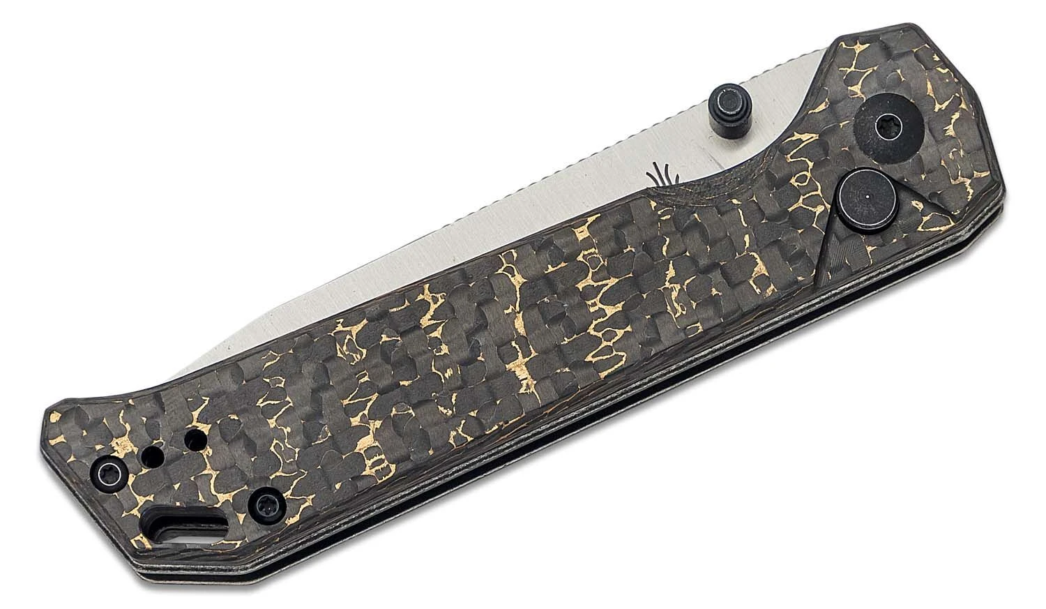 Die Klinge ist aus rostfreiem CPM-20CV-Stahl gefertigt. Es lässt sich mit einem Stift an der Klinge öffnen und wird durch eine Knopfverriegelung in der offenen Position gehalten. Der einzelne Griff ist aus einem interessanten FAT-Carbonmaterial gefertigt. Am Ende des Griffs befindet sich ein Loch für ein Schlüsselband. Das Messer ist mit einem Clip zum Tragen in einer Tasche ausgestattet.