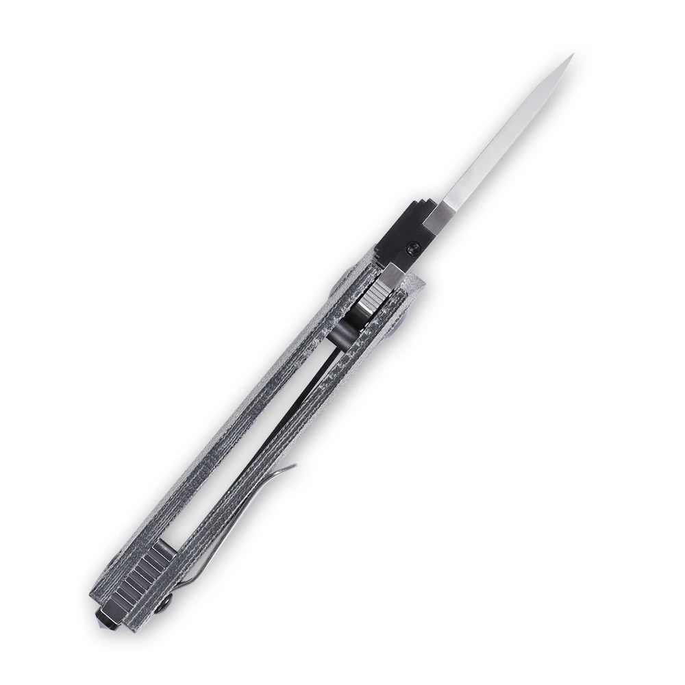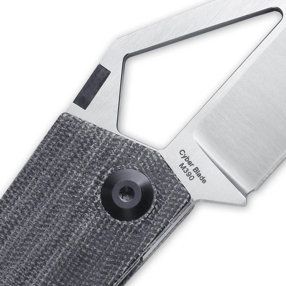 Die Klinge aus hochwertigem M390-Stahl öffnet sich mit einem modifizierten Stift an der Klinge und wird durch eine Linerlock-Sicherung in der offenen Position gehalten. Der Griff besteht aus Micarta, und am Ende des Griffs befindet sich eine glasbrechende Spitze. Das Messer ist mit einem Clip zum Tragen in einer Tasche ausgestattet.