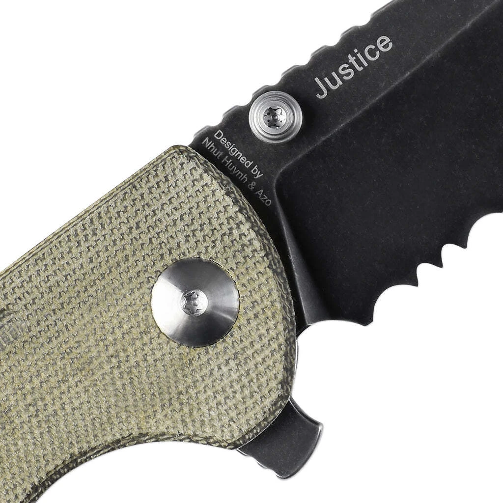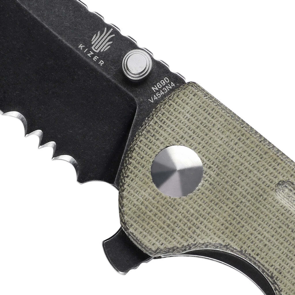 Die teilweise gezahnte Klinge ist aus hochwertigem N690-Stahl gefertigt. Sie wird mit einem Flipper geöffnet und durch eine Linerlock-Sicherung in der offenen Position gehalten. Der Griff ist aus Micarta gefertigt. Am Ende des Griffs befindet sich ein Loch für ein Schlüsselband. Das Messer ist mit einem Clip zum Tragen in einer Tasche ausgestattet.
