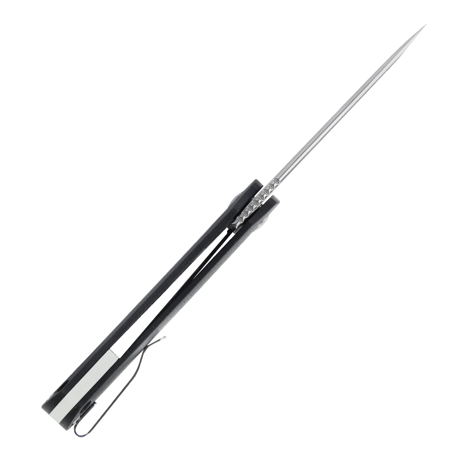 Die Klinge aus hochwertigem N690-Stahl öffnet sich mit einem Frontflipper und wird durch eine Linerlock-Sicherung in der offenen Position gehalten. Der Griff ist aus strapazierfähigem G10-Material gefertigt. Am Ende des Griffs befindet sich ein Loch für ein Schlüsselband. Das Messer ist mit einem Clip zum Tragen in einer Tasche ausgestattet.