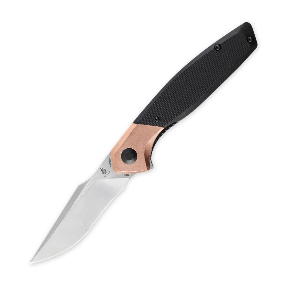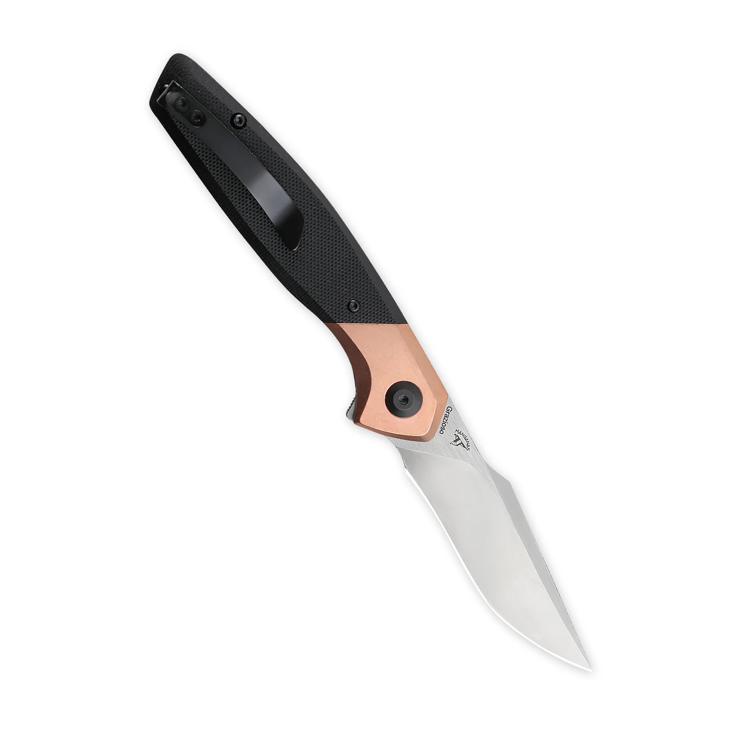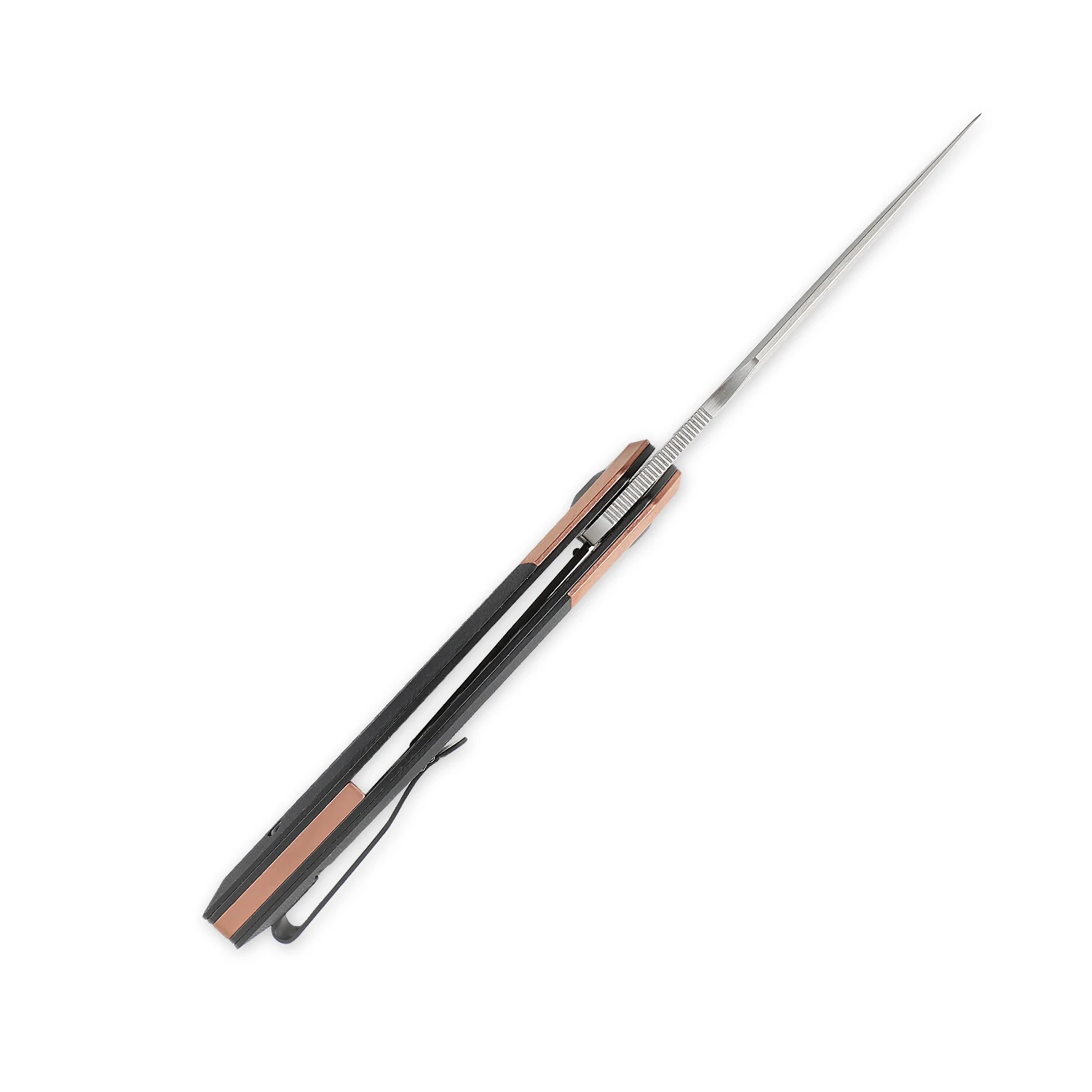 Die Klinge aus hochwertigem N690-Stahl lässt sich mit einem Flipper öffnen und wird durch einen Linerlock-Verschluss in der offenen Position gehalten. Der Griff ist aus Kupfer und G-10 mit einer feinen Textur für einen besseren Halt gefertigt. Das Messer ist mit einem Clip zum Tragen in der Tasche ausgestattet.