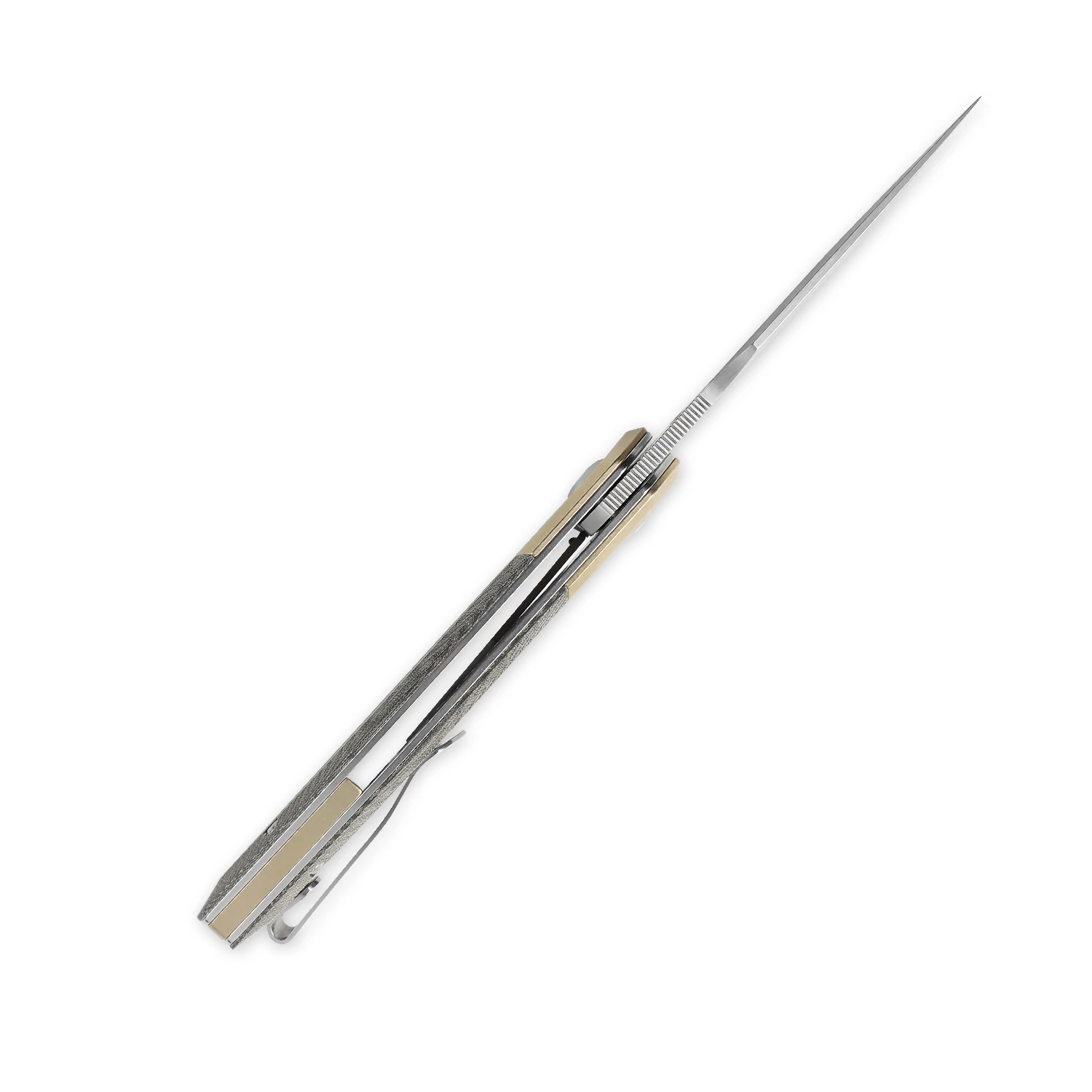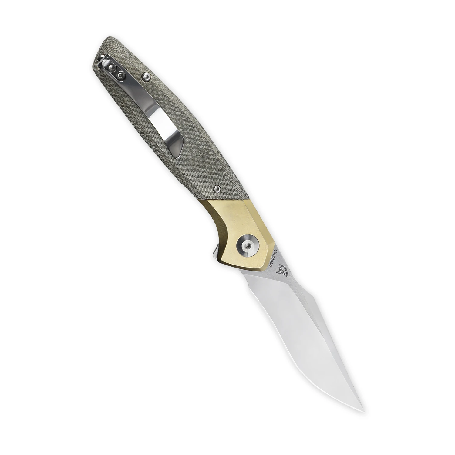 Die Klinge aus hochwertigem N690-Stahl lässt sich mit einem Flipper öffnen und wird durch einen Linerlock-Verschluss in der offenen Position gehalten. Der Griff ist aus Messing und Micarta mit einer feinen Textur für einen besseren Halt gefertigt. Das Messer ist mit einem Clip zum Tragen in der Tasche ausgestattet.