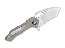 Kizer Mini Paragon Micarta GreenDas Kizer Mini Paragon beeindruckt vor allem mit seinem bulligen Erscheinungsbild. Die breite Tanto Klinge aus 154CM, die große Daumenöffnung, die kiemenartigen Auslassungen – dieses Messer will einfach nur schneiden und nimmt es mit allen Arbeiten auf, egal ob bei Outdoor, Camping oder im Alltag. Der ausgeformte Griff aus grünem Micarta liegt dabei sicher in Hand und beherbergt den robusten Liner Lock. Besonders hervorzuheben ist hierbei die blau anodisierte Klingenachsschraube, die optisches Ausgangszentrum des Messers ist. Mit Clip (Tip-Up/r).Technische DatenGesamtlänge: 22 cmKlingenlänge: 8,7 cmKlingenstärke: 3,2 mmGewicht: 196 GrammKlingenmaterial: 154CMGriffmaterial: MicartaVerschluss: LinerlockÖffnungshilfe: FlipperÖffnungsmechanismus: ManuellFarbe: GrünKlingenfarbe: Unbeschichtet