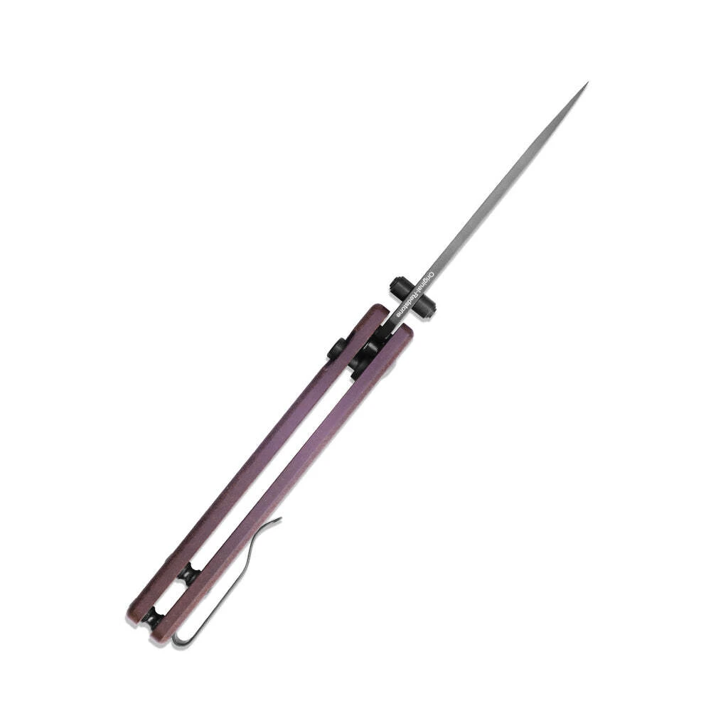 Die Klinge aus hochwertigem 154CM-Stahl öffnet sich mit einem Stift auf der Klinge und wird durch eine Knopfverriegelung in der offenen Position gehalten. Der Griff ist aus modernem Richlite-Material gefertigt. Das Messer ist mit einem Clip zum Tragen in einer Tasche ausgestattet.