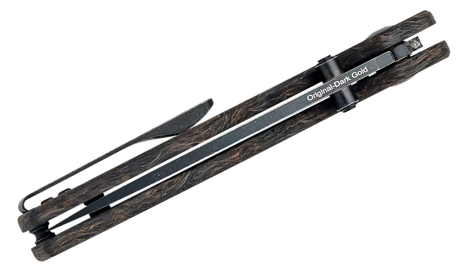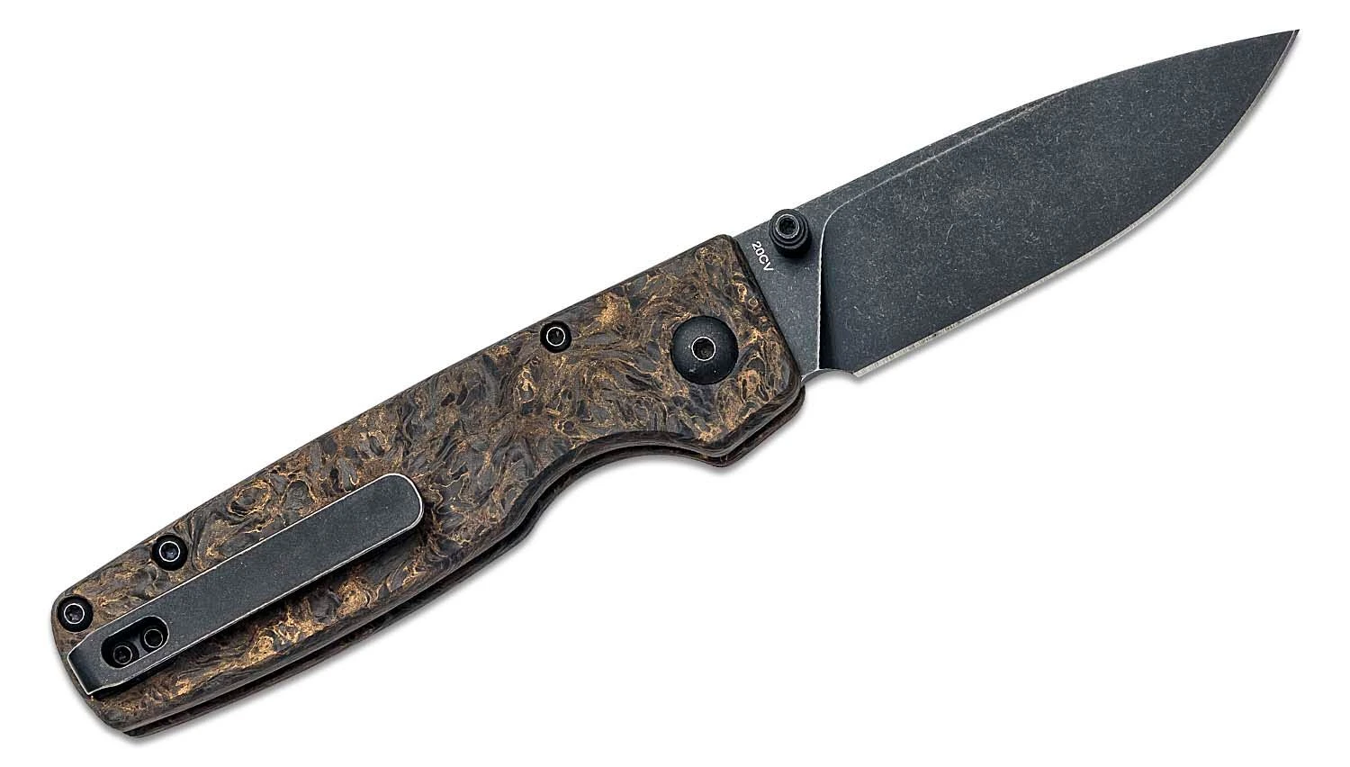 Die Klinge aus hochwertigem CPM-20CV-Stahl lässt sich mit einem Stift an der Klinge öffnen und wird durch eine Knopfverriegelung in der offenen Position gehalten. Der Griff ist aus einem interessanten FAT-Carbon-Material gefertigt. Das Messer ist mit einem Clip zum Tragen in einer Tasche ausgestattet.
