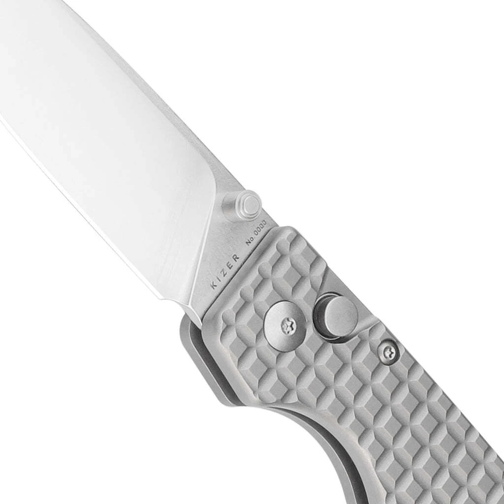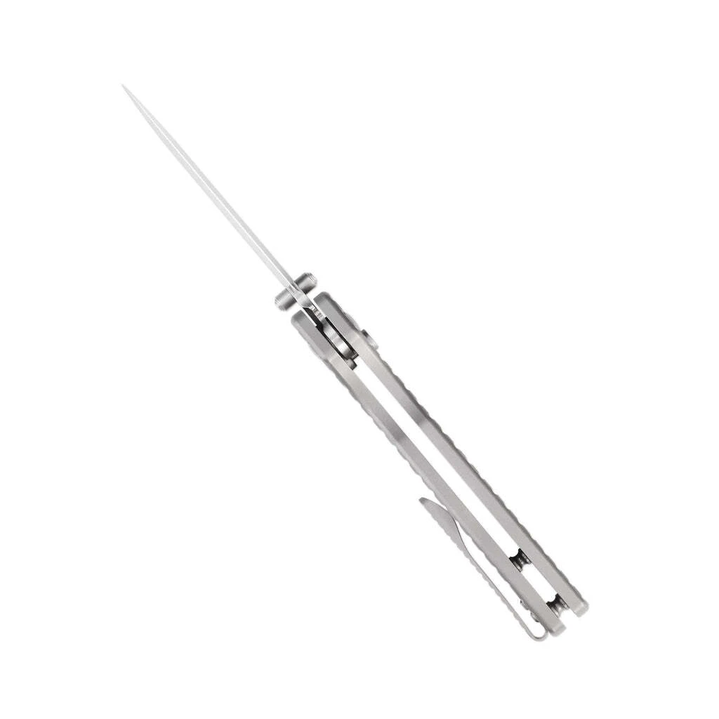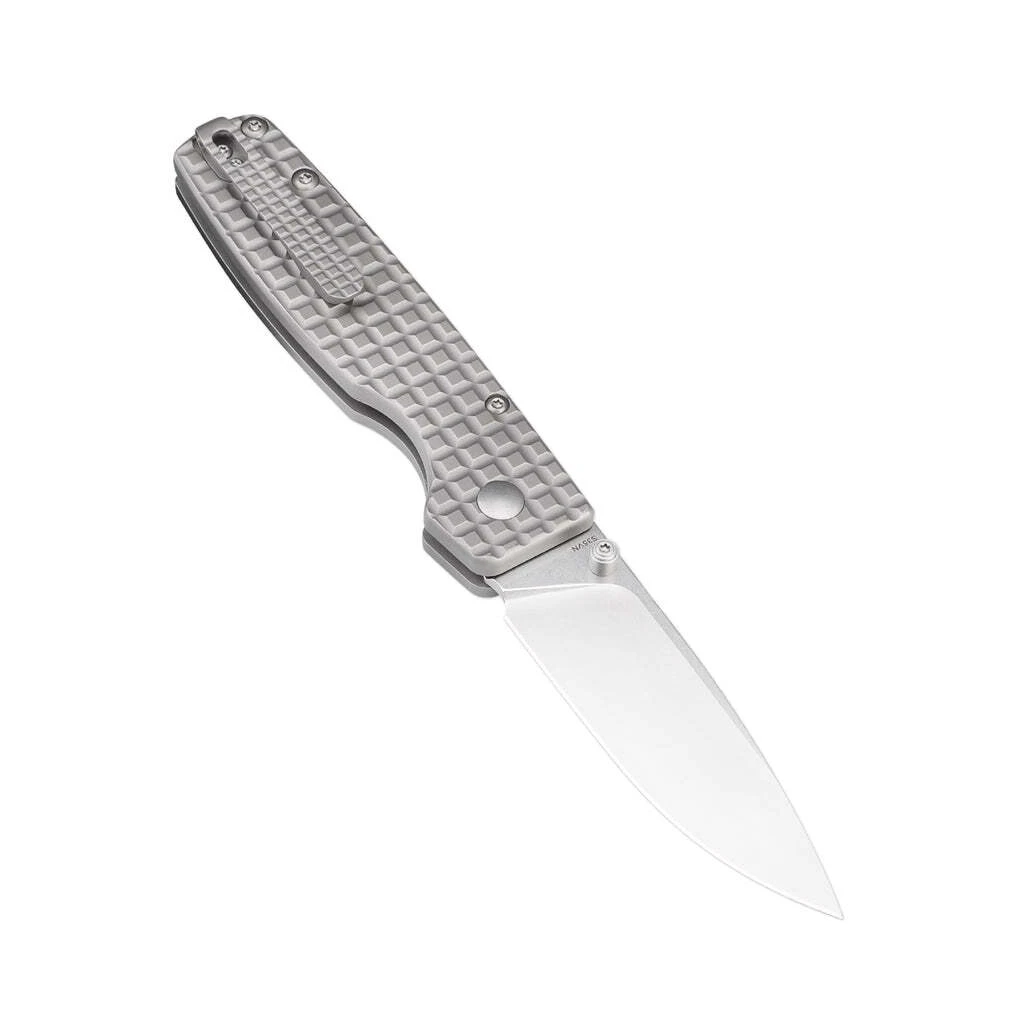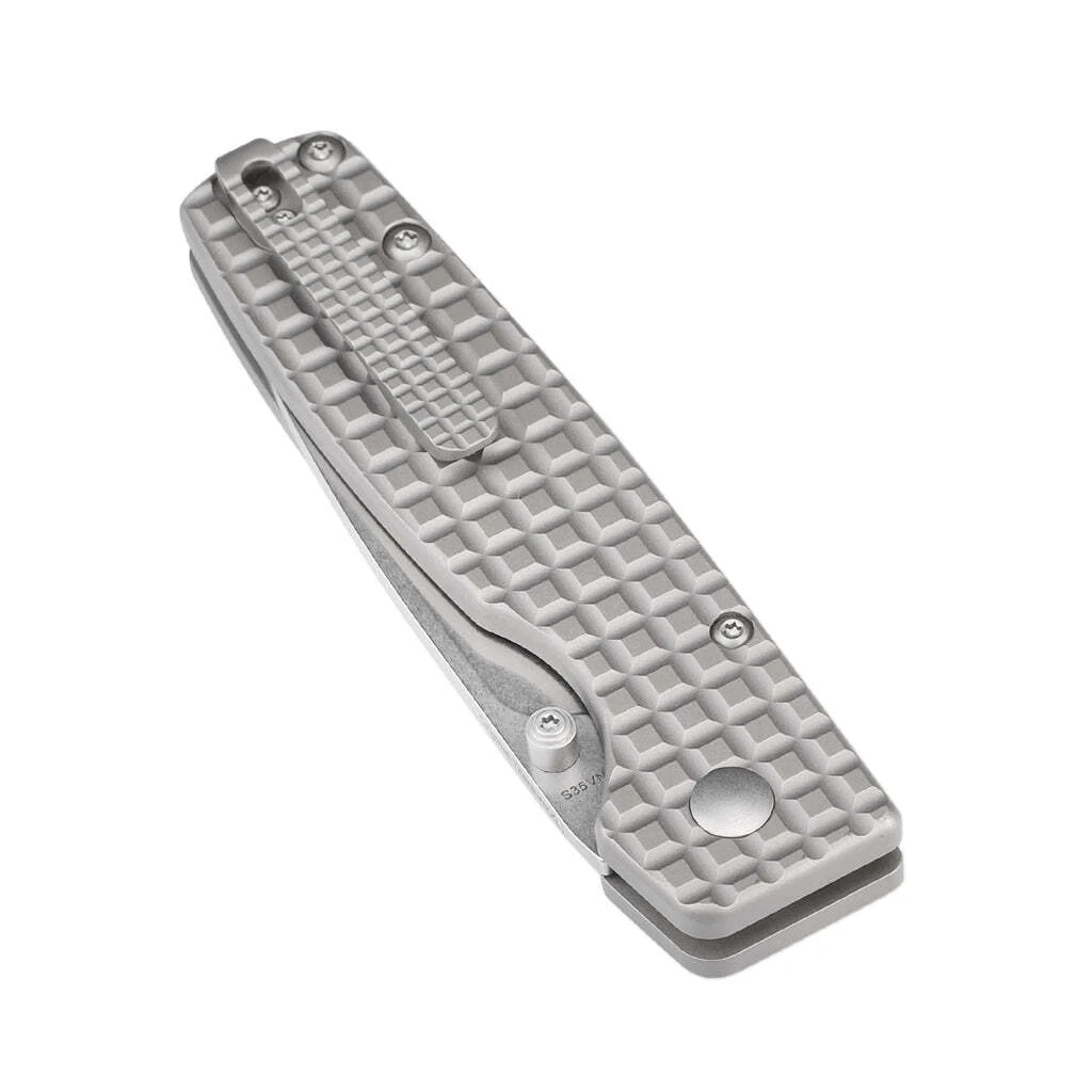 Die Klinge aus hochwertigem CPM S35VN-Stahl öffnet sich mit einem Stift auf der Klinge und wird durch einen Button-Lock in der offenen Position gehalten. Der Griff ist aus Titan gefertigt. Das Messer ist mit einem Clip zum Tragen in einer Tasche ausgestattet.