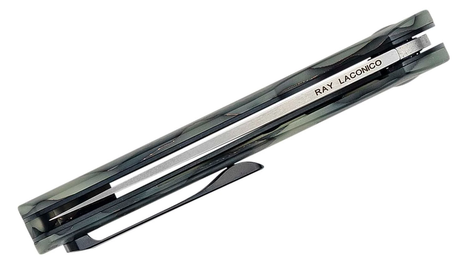 Die Klinge aus CPM-S35VN-Qualitätsstahl lässt sich mit einem Flipper öffnen und wird durch eine Linerlock-Sicherung in der offenen Position gehalten. Der Griff ist aus Raffir Nobble Material gefertigt. Am Ende des Griffs befindet sich ein Loch für ein Schlüsselband. Das Messer ist mit einem Clip zum Tragen in einer Tasche ausgestattet.
