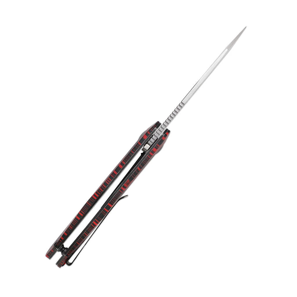 Die Klinge aus 154CM-Qualitätsstahl öffnet sich mit einem Flipper und wird durch einen Linerlock-Verschluss in der offenen Position gehalten. Der Griff ist aus G10-Material mit Damastmuster gefertigt. Das Messer ist mit einem Clip für das Tragen in der Tasche ausgestattet.