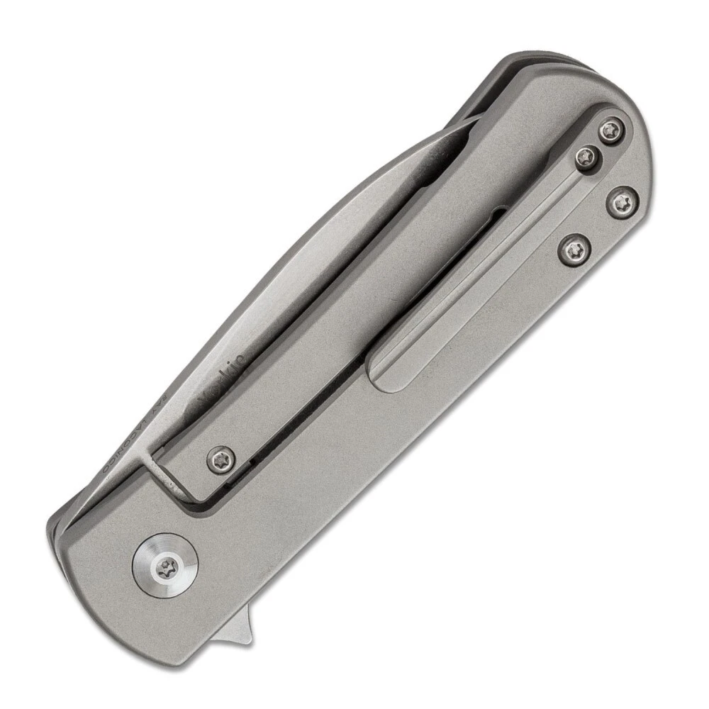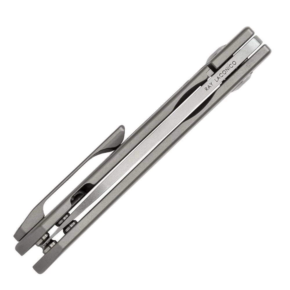 Die Klinge aus hochwertigem CPM-S35VN-Stahl lässt sich mit einem Flipper öffnen und wird durch einen Framelock-Verschluss in geöffneter Position gehalten. Der Griff ist aus Titan gefertigt. Das Messer ist mit einem Clip zum Tragen in einer Tasche ausgestattet.
